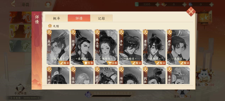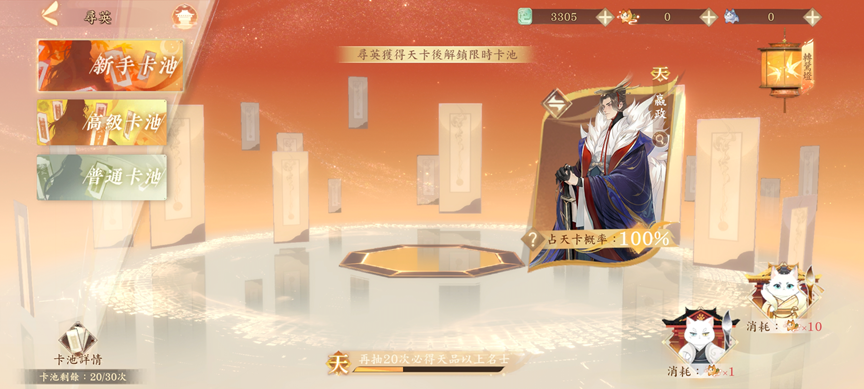 1. 一定先抽滿新手卡池!一定先抽滿新手卡池!一定先抽滿新手卡池!新手卡池有獨特的保底機制,抽取之前可以在六名天階名士中選擇一名作為保底獎勵,並且保底次數只需要30次。