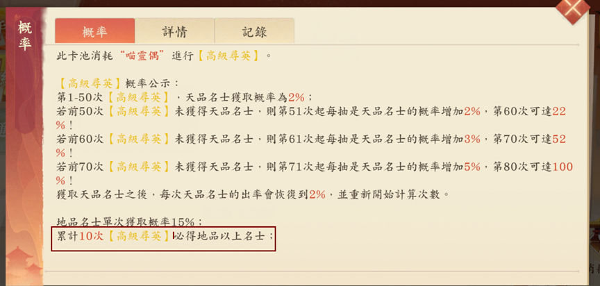 所以小編推薦各位使君大大如果要抽取名士的話,著重新手卡池和高級卡池。