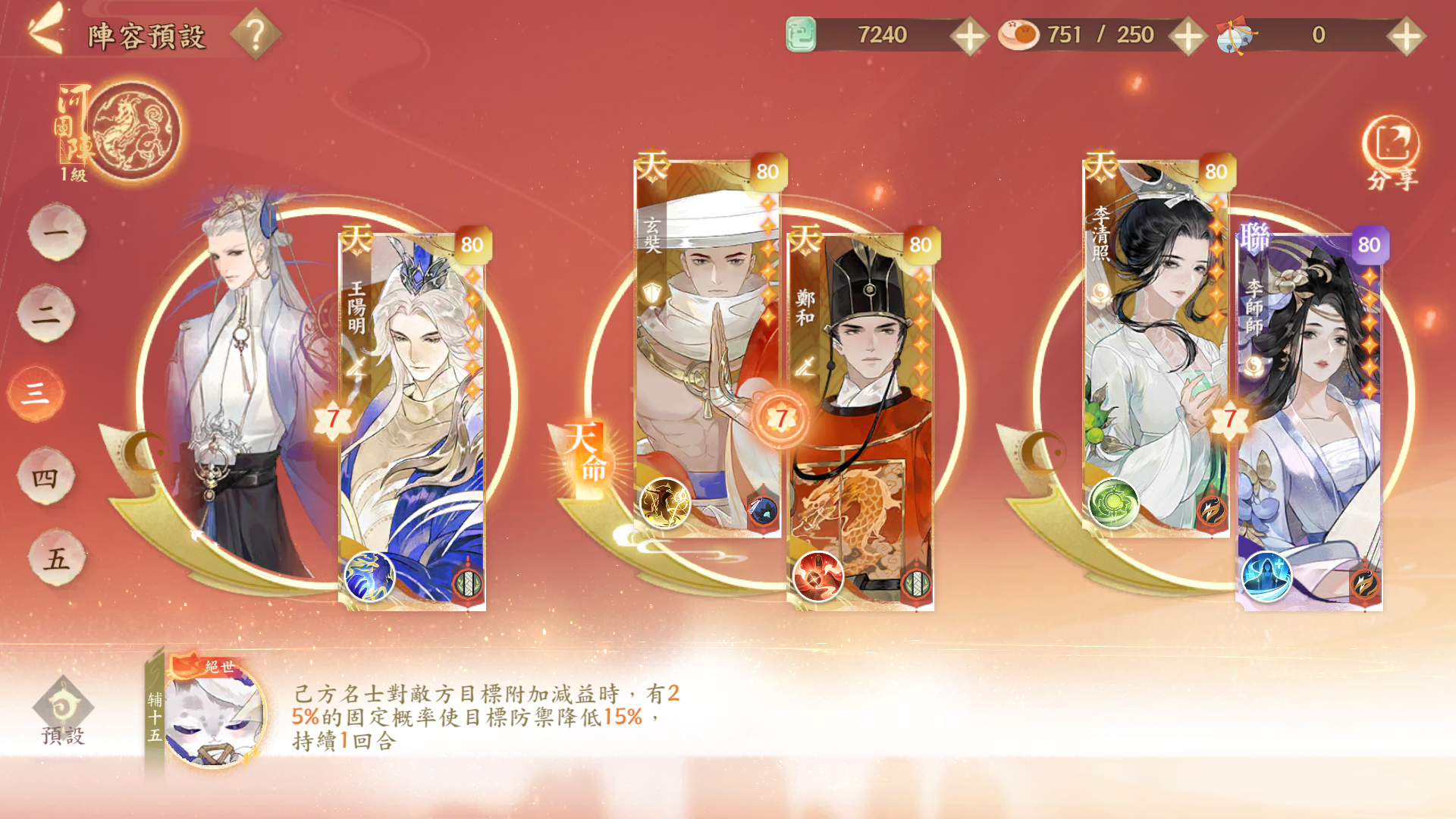 利用王陽明給敵方附加【複理】,堆疊後配合覺醒技能【知行合一】給敵方全體打出高額生命上限削減,由李清照提供點火提速,李師師提供免疫控制,確保玄奘覺醒【西行萬里】持續開啟,並由鄭和堆疊【駭浪】打出高額傷害補全最終傷害。