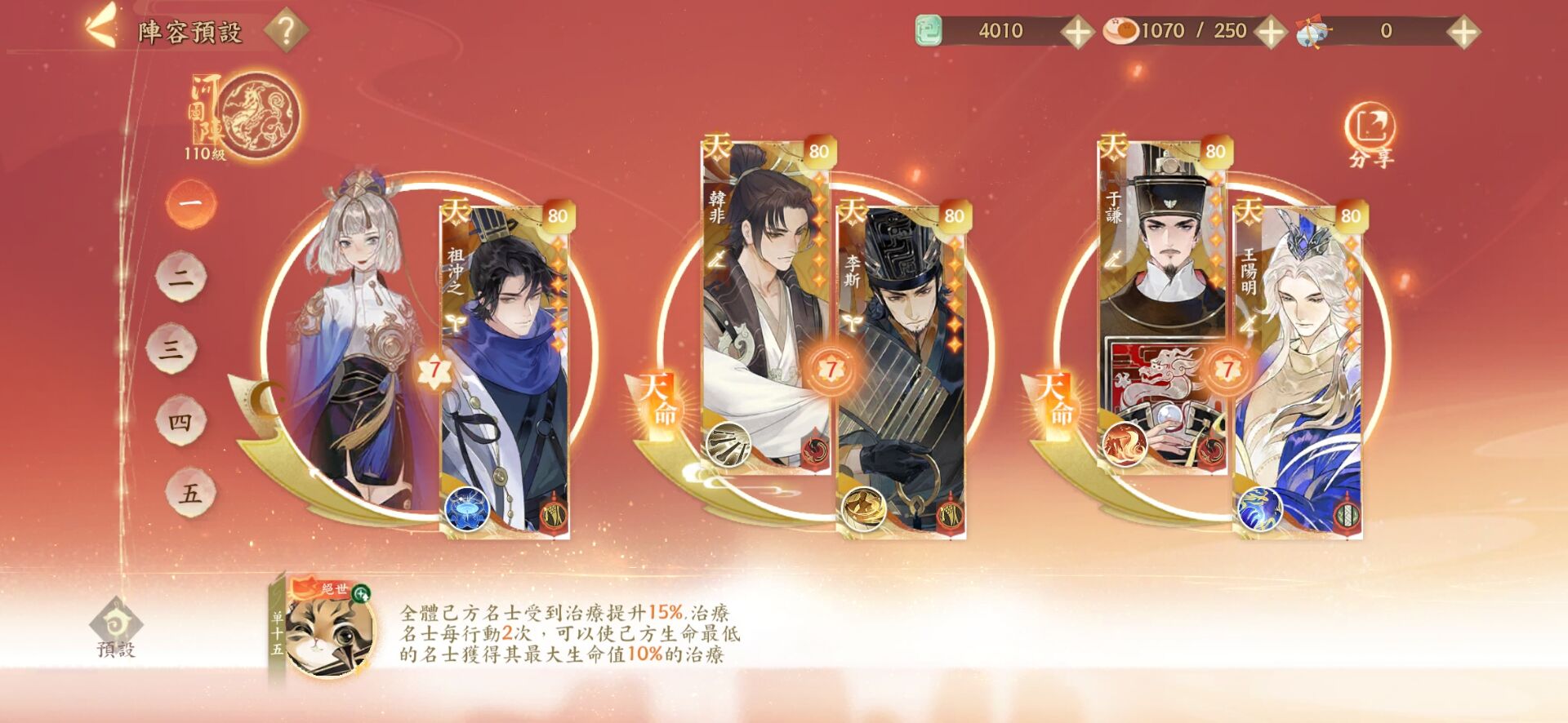 該陣容講究高強度治療及高爆發輸出,韓非、于謙的群體攻擊效果能使李斯每大回合的的治療量拉至最高,祖沖之的被動【新曆】效果【閏分】能確保祖沖之即使被秒殺也能給隊伍帶來客觀的治療,同時普攻技能【缀術】更是可以看作強化版的楊玉環。逆勢情況下,覺醒技能【改易】能將已退場的己方輸出拉回戰場,並帶有原有增益效果,作到短時間內雙爆發扳回局面。