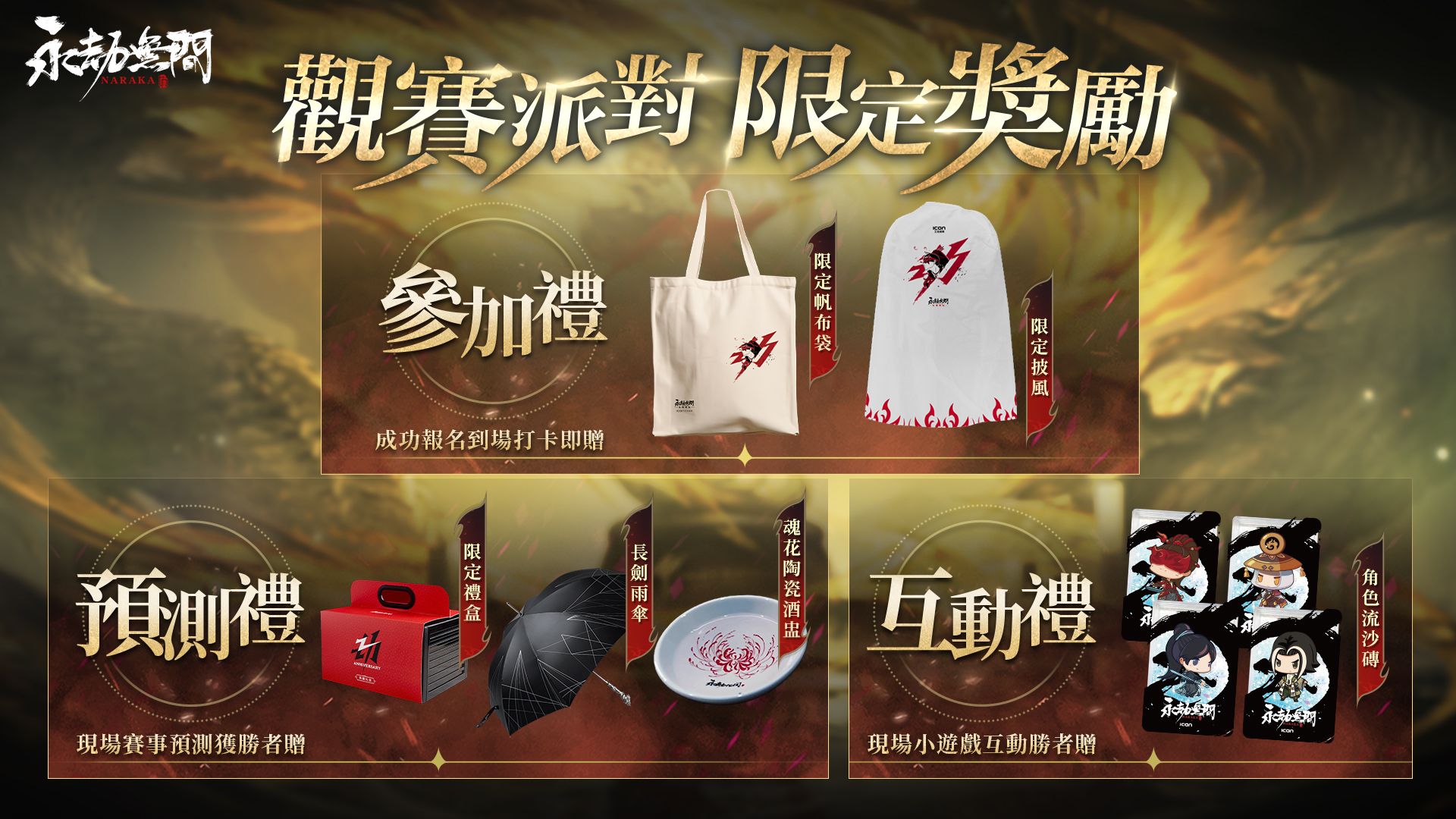 報名福利:成功獲取入場資格者,當日到場完成打卡即可獲得限定觀賽周邊禮品一份,並享用下午茶,成功報名者將會被分成四個隊伍與KOL們一起進行互動競賽,還有機會獲得限量周邊!
