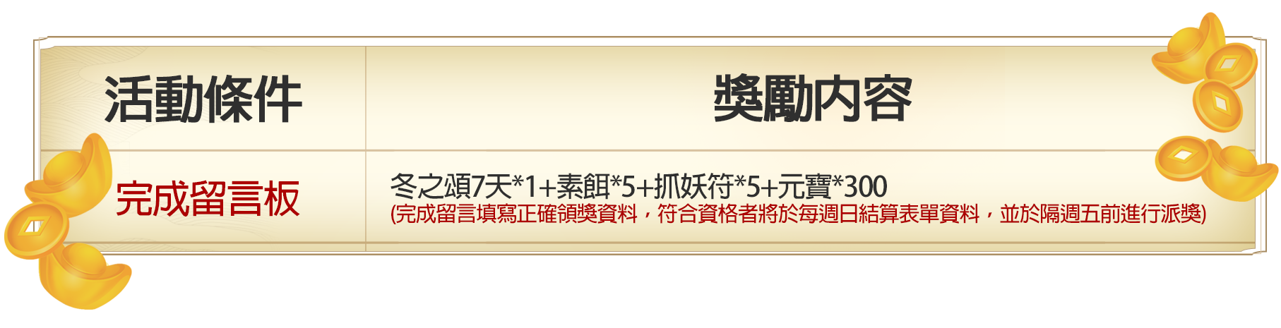 2. 留言板獎勵「冬之頌7天*1+素餌*5+抓妖符*5+元寶*300」將於完成活動並填寫領獎表單後一週內統一派獎。