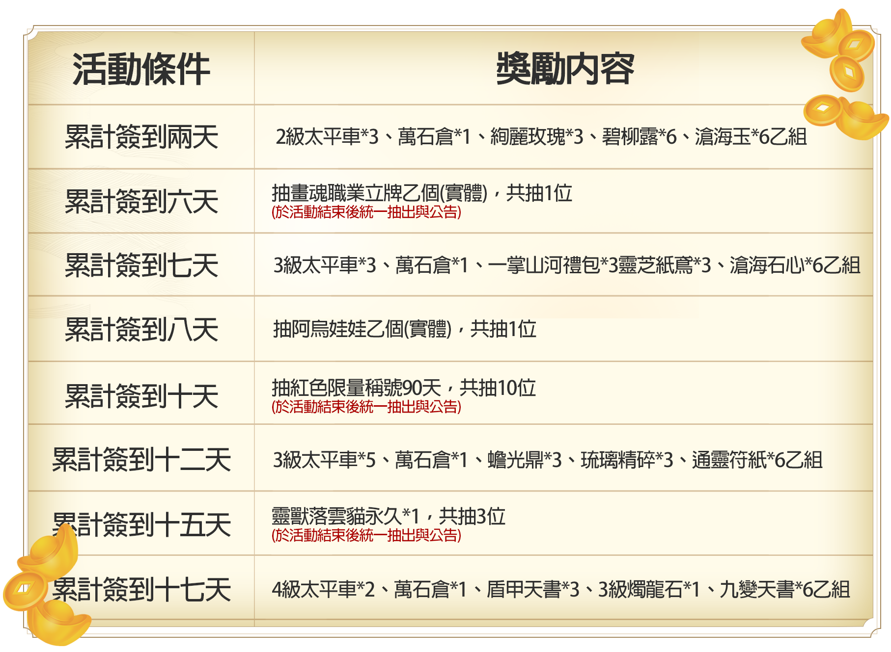 1. 簽到獎勵阿烏娃娃、畫魂職業立牌、限量稱號、靈獸落雲貓等獎勵將於活動結束後抽出,得獎公告於2023/1/2於粉絲團公布。其餘虛寶將於達成簽到門檻後以序號於網頁派發,序號於同一個遊戲帳號僅限兌換一次,兌換期限於2023/1/30截止,請盡早兌換逾期即無效。