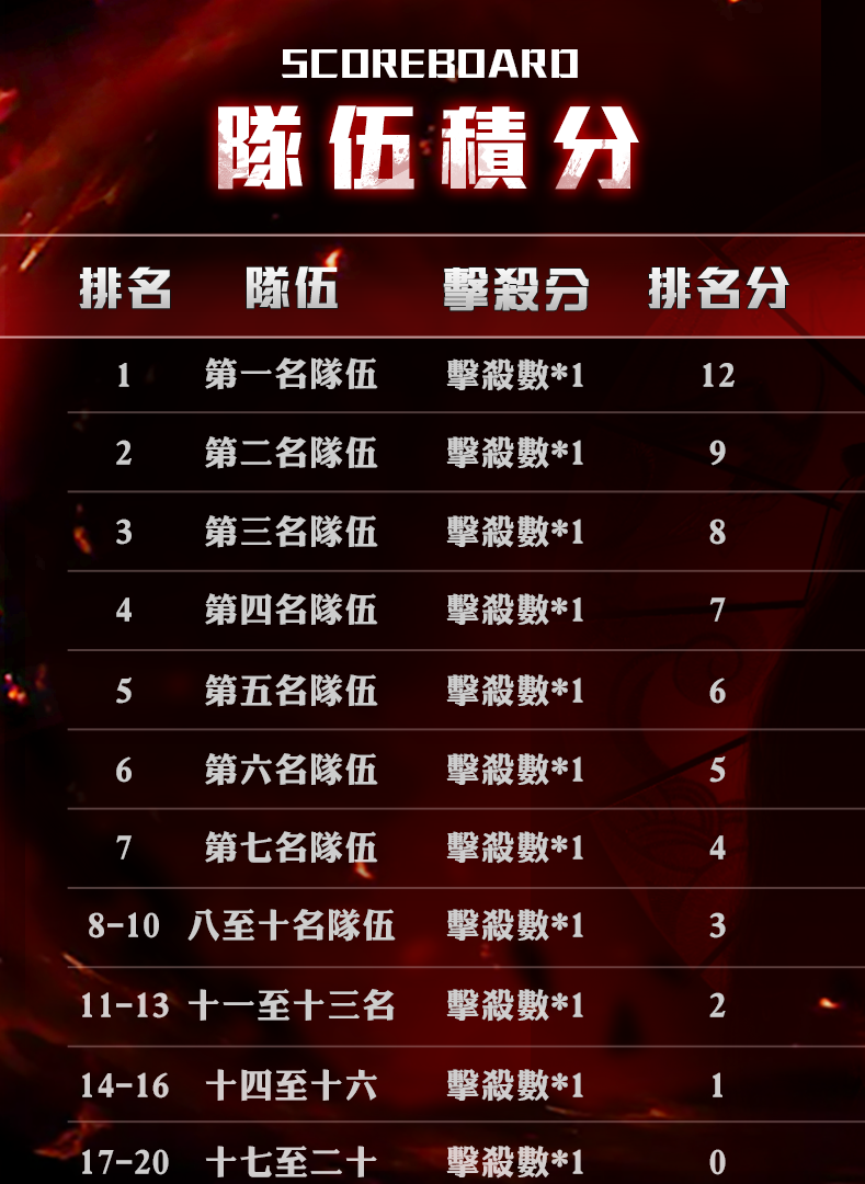 (同分判定機制:若最終積分相同者,將依序比較同分隊伍之「總擊殺數」、「單局最高積分」)